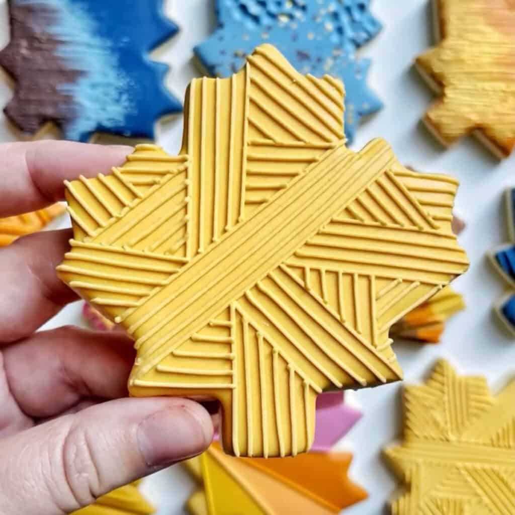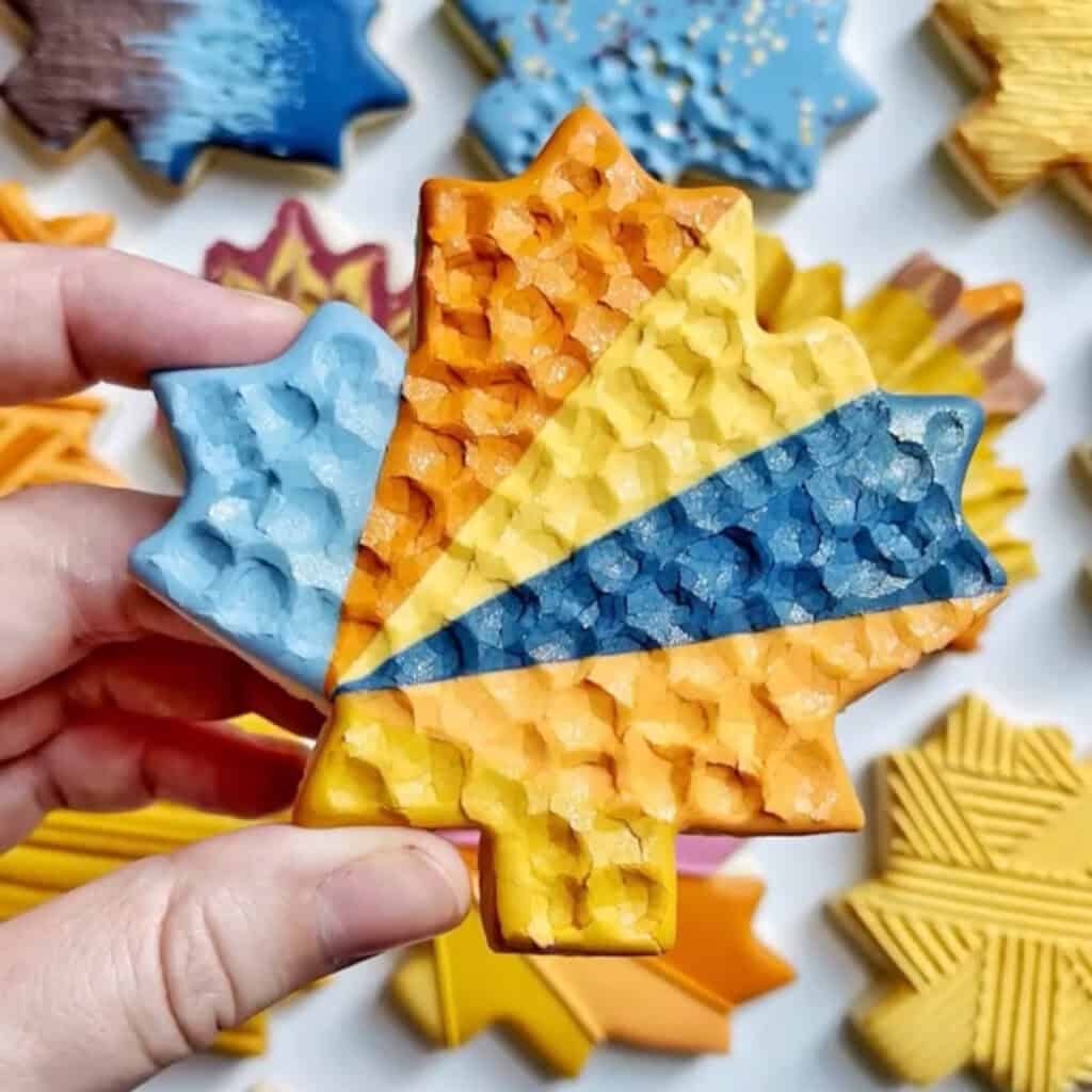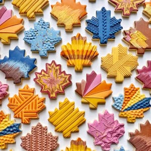 In this set of maple leaf cookies, we will explore a ton of different varieties of textures and techniques, all with royal icing. There will be some extra tools like parchment paper, edible glitter, and luster dust to take your designs to the next level.