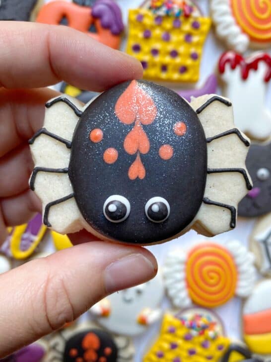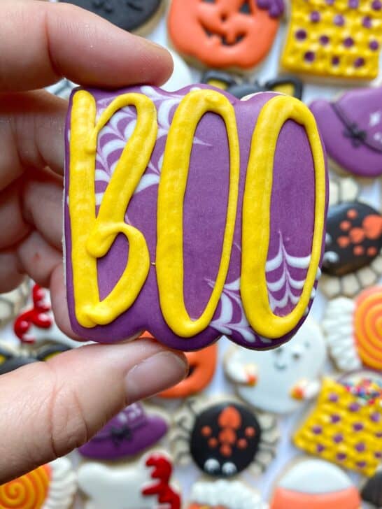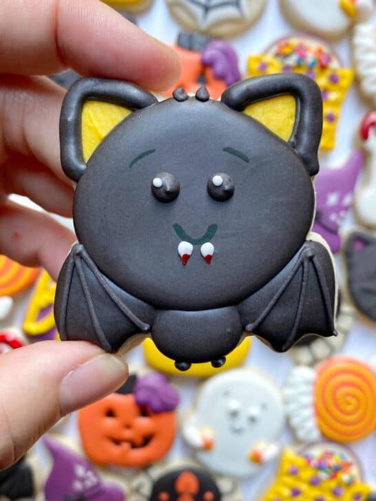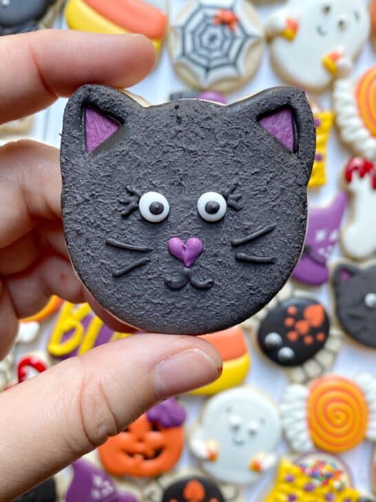 This set of mini Halloween cookies utilizes slightly chubby mini cookie cutters (I can’t stand the truly tiny ones) to create a classic, cute and playful set of designs. With a couple of added techniques to increase the texture and fun variety, these are sure to be a hit! You can even make these designs on regular-sized cutters (in the 3-3.5″ range).